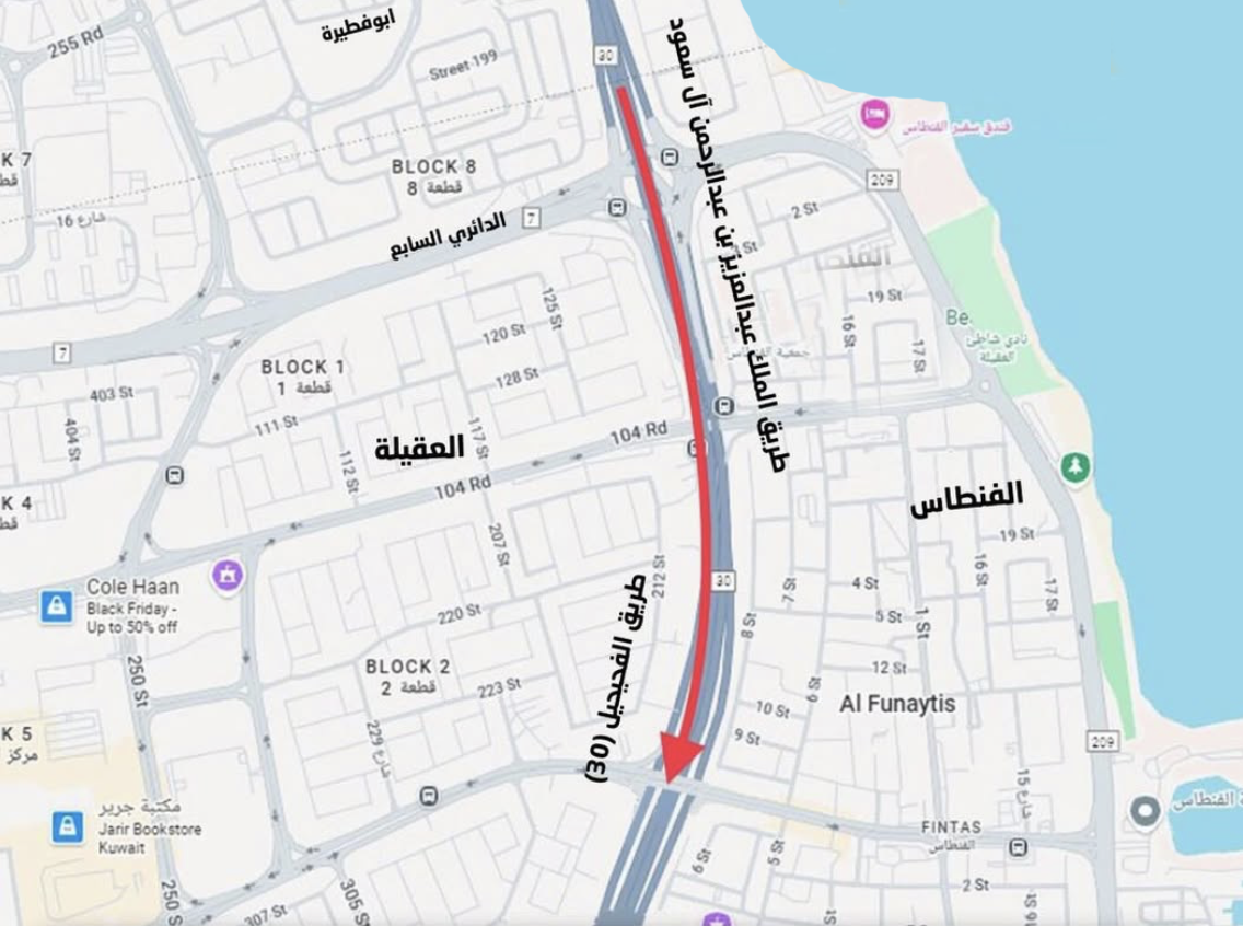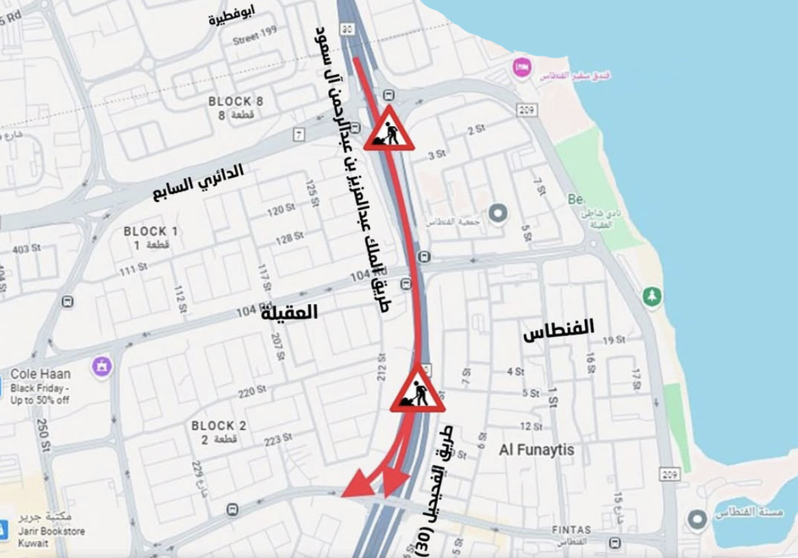 اغلاق الحارة اليسرى السريعة والحارة الوسطى على طريق الملك عبدالعزيز بن عبد الرحمن آل سعود طريق الفحيحيل السريع