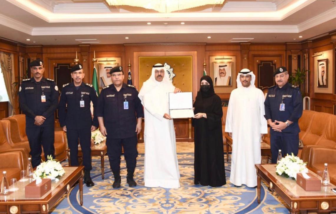 معالي النائب الاول لرئيس مجلس الوزراء ووزير الداخلية الفريق اول متقاعد الشيخ احمد نواف الاحمد الجابر الصباح يكرم العقيد محمد راشد الهاجري والسيدة مديحة سعود العنزي من قطاع المرور والعمليات